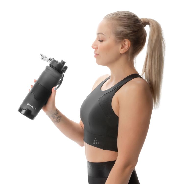 Gymstick Tritan Water Bottles are made from innovative glass-like Tritan plastic. The material is BPA-free, extremely durable, shatter-proof as well as odorless and leaves no taste in the water you drink. Button cap can be operated with one hand and has a secure locking mechanism. The rubber surface on the bottle offers better grip during training. The bottle has a handy carry strap and a removable ice strainer inside